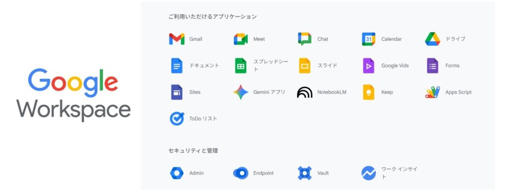 生成AI、文書作成、表計算、プレゼンテーションなどGoogleの代表的なアプリケーションをすべて安全にご利用できます。